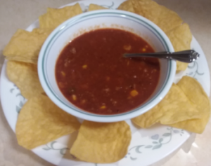 Because we are a bigger family, I have halved my recipe for you. If you are a single eater, you can make a batch of this taco soup and freeze the extras in quart size freezer bags into portions to eat for a later time. I’ve put leftovers in a freezer bag with our extras and it’s about 2 c. of taco soup for a filling bowl of soup. When taco soup is reheated, it makes a very quick and hot meal.