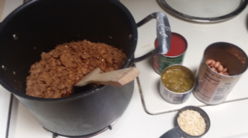*A couple of my kids are NOT fond of beans and/or chunks of tomatoes; but for me, those flavors are necessary to make taco soup. (smile) Therefore, I use my blender glass and place 1/2 of the beans and 1/2 of the fire roasted tomatoes into the blender and whiz them up. I toss both the whole tomatoes, beans and tomato-bean puree into the soup pot. Then when they pick out the beans and/or tomatoes, I know that they have at least eaten "most" of the soup.